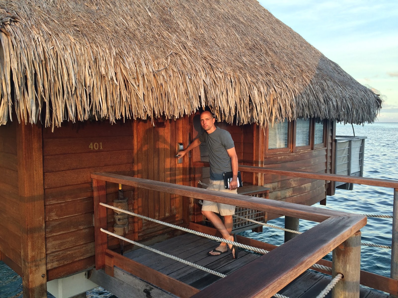 We arrived on Moorea just in time for sunset and to get checked in to our over water bungalow. The hotel experience was amazing. The grounds were beautiful. The room had a glass bottom floor where we could spot fish swimming in the coral below. Breakfast buffet was included. Restaurants were on site which saved us time in looking for places to eat, although we did venture out to other restaurants for dinner on occasion. Everything was very tranquil and beautiful like you'd expect from a tropical paradise vacation.